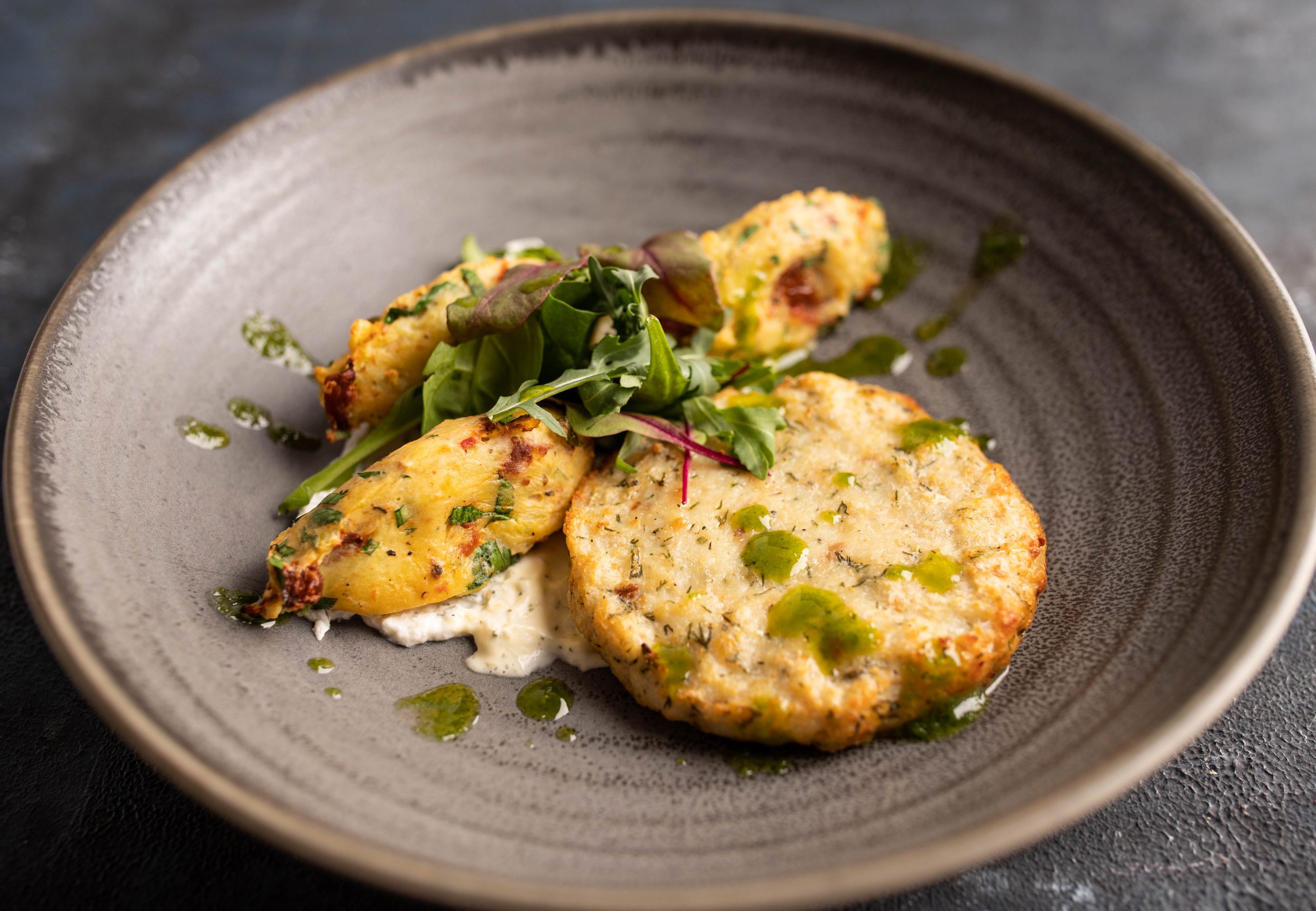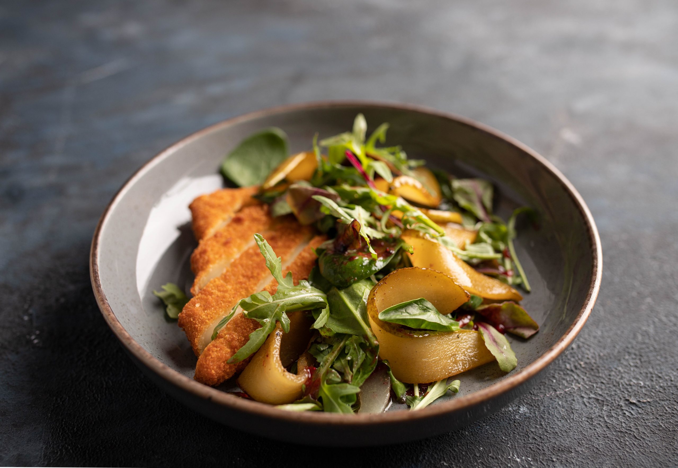 Микс салата, груша карамелизированная, сулугуни в панировке, соус ягодно-мятный.