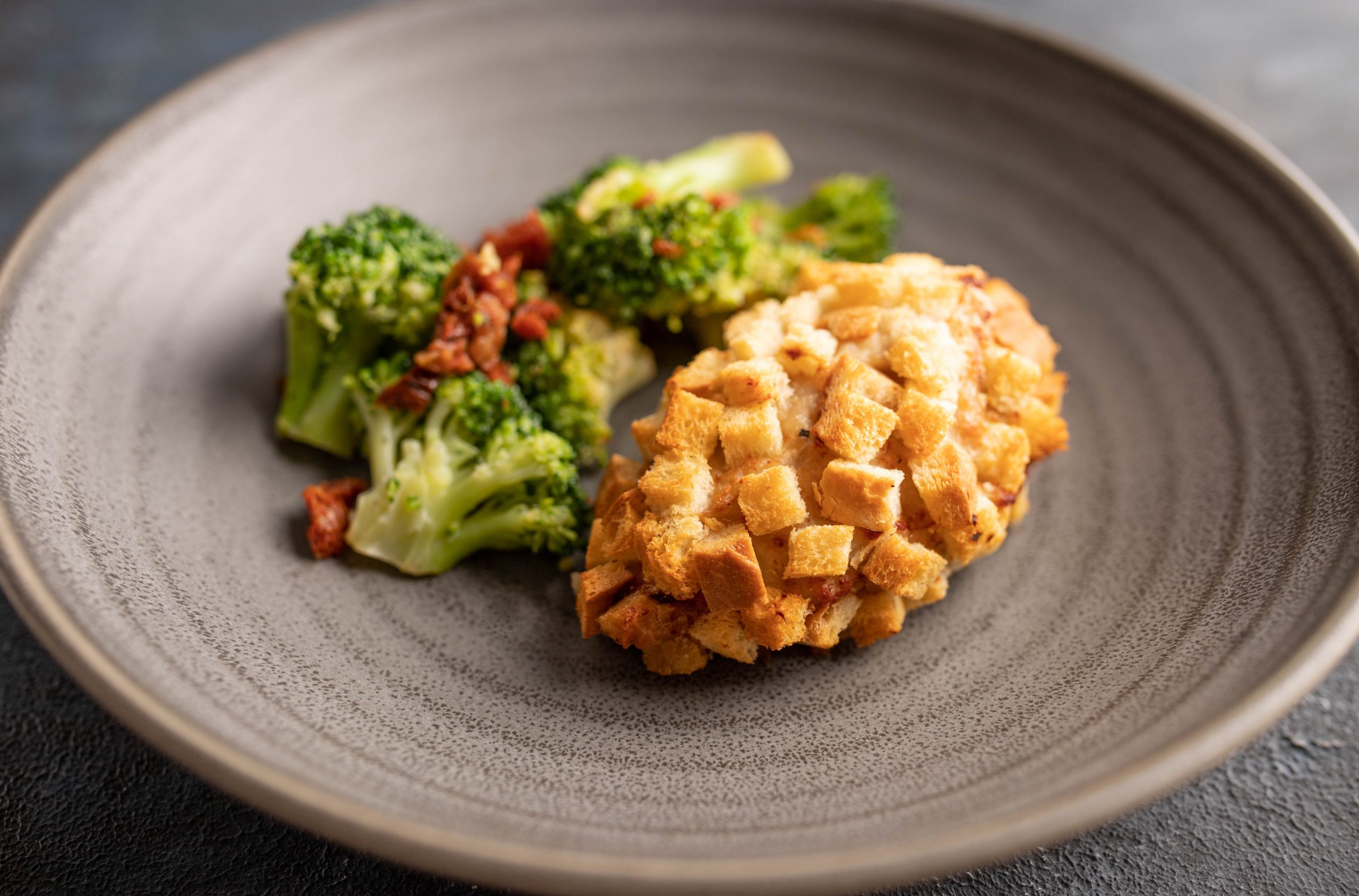 Куриное филе, бекон, помидор, огурец, картофель, микс салата, яйцо пашот, соус пинк айоли, соус цитрусовый,соус релиш, лук фри