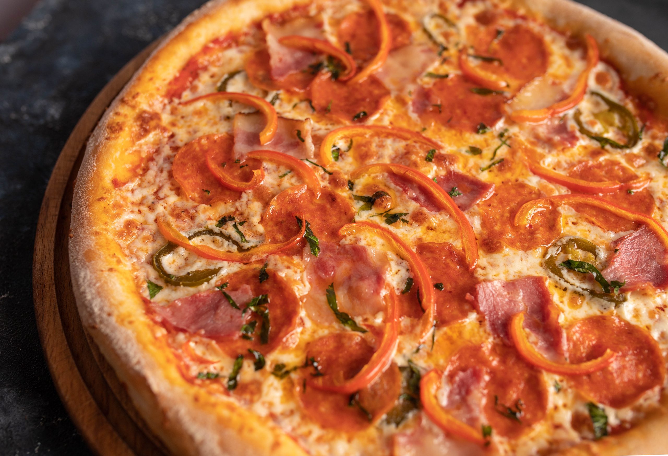 Томатный соус том ям, сыр моцарелла, халапеньо, перец болгарский, пепперони, бекон, петрушка