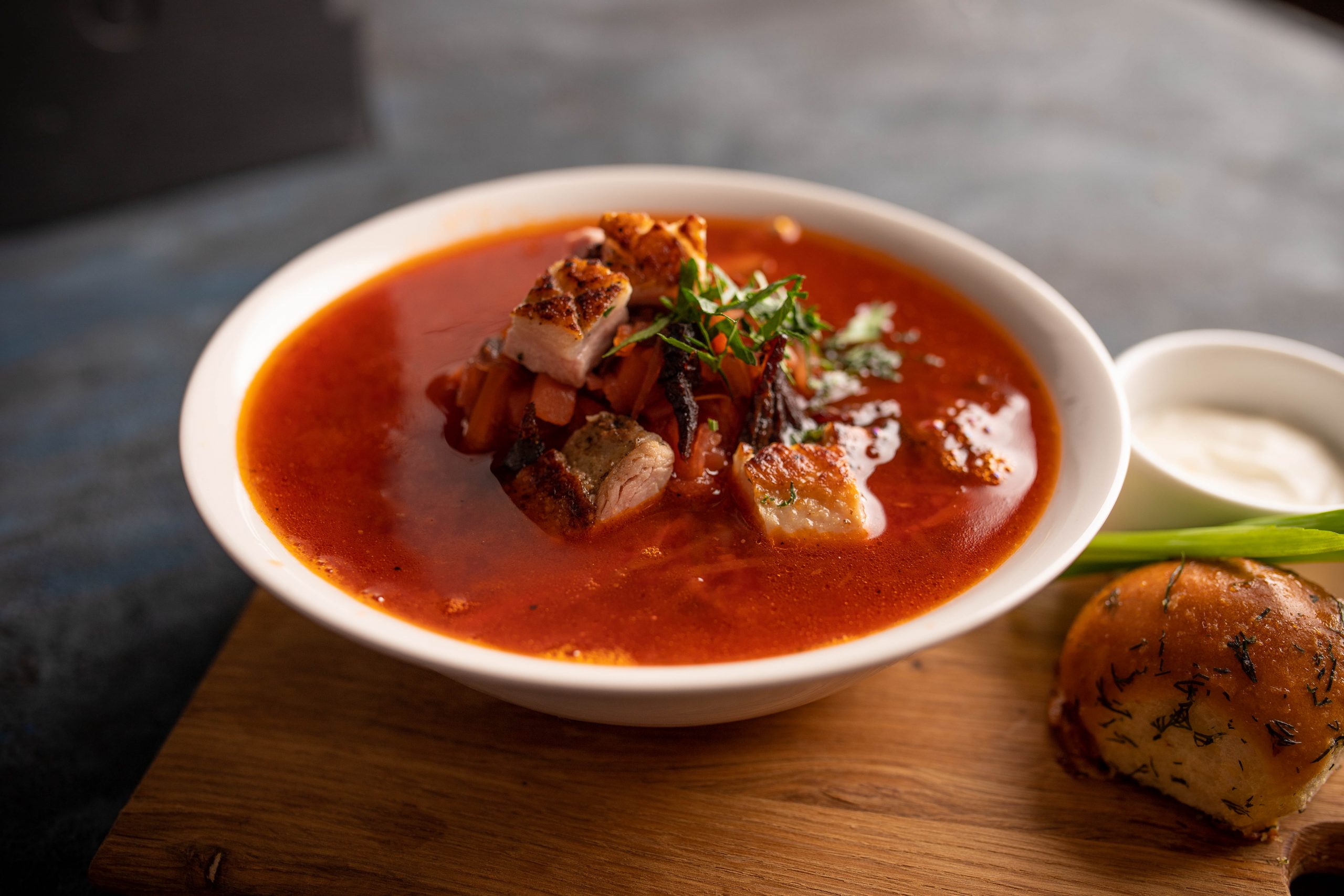 Авторский борщ с добавлением чернослива и утки, и нотками копченности.