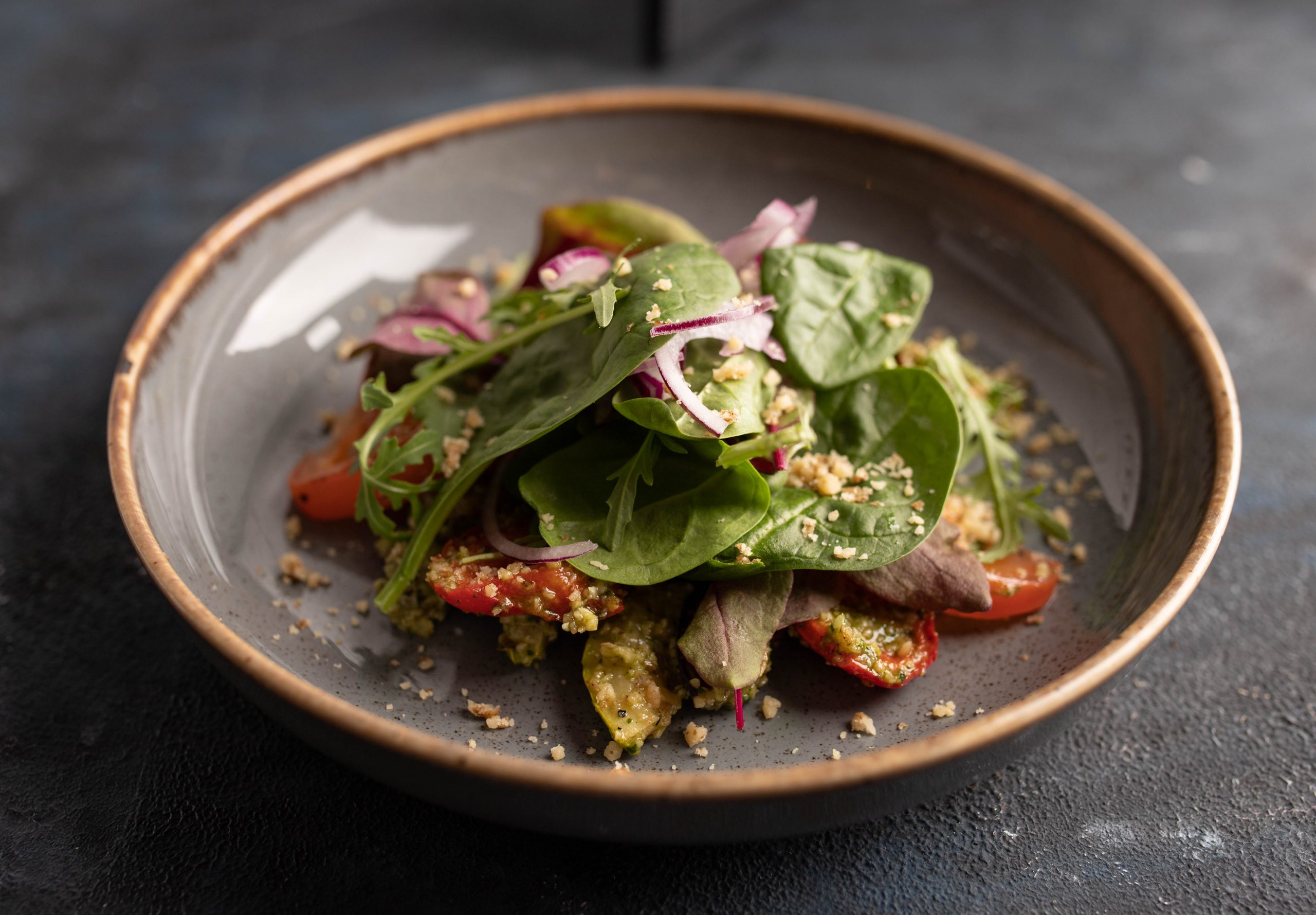 Баклажаны, кабачки, перец болгарский, томаты, микс зелени, лук красный, заправка из кунжутного масла с грецким орехом и кинзой.